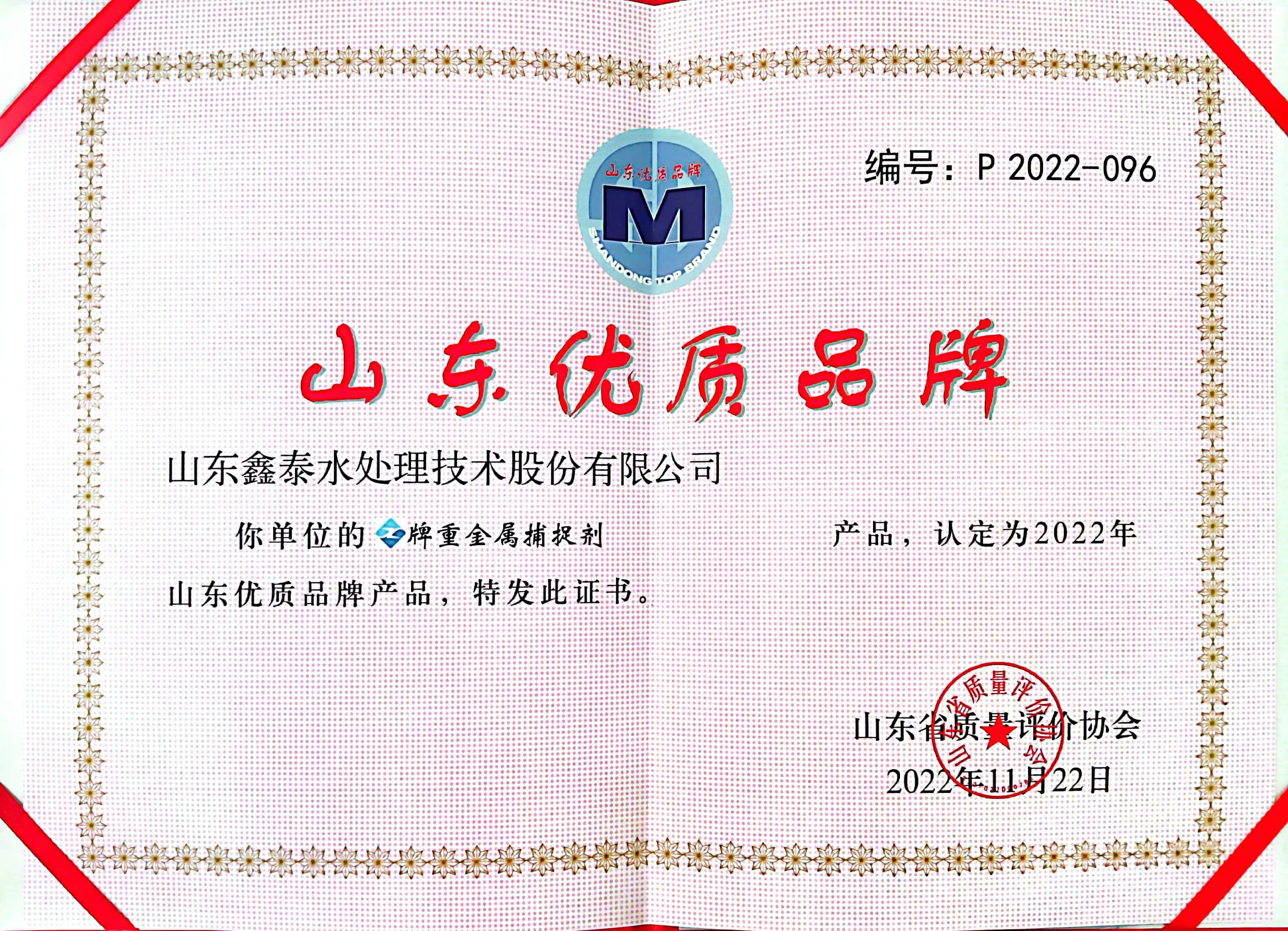 近日,山東省質量評價協(xié)會公布了2022年山東優(yōu)質品牌產(chǎn)品認定結果,山東鑫泰水處理技術股份有限公司生產(chǎn)產(chǎn)品“重金屬捕捉劑”入選“2022年山東優(yōu)質品牌產(chǎn)品”。