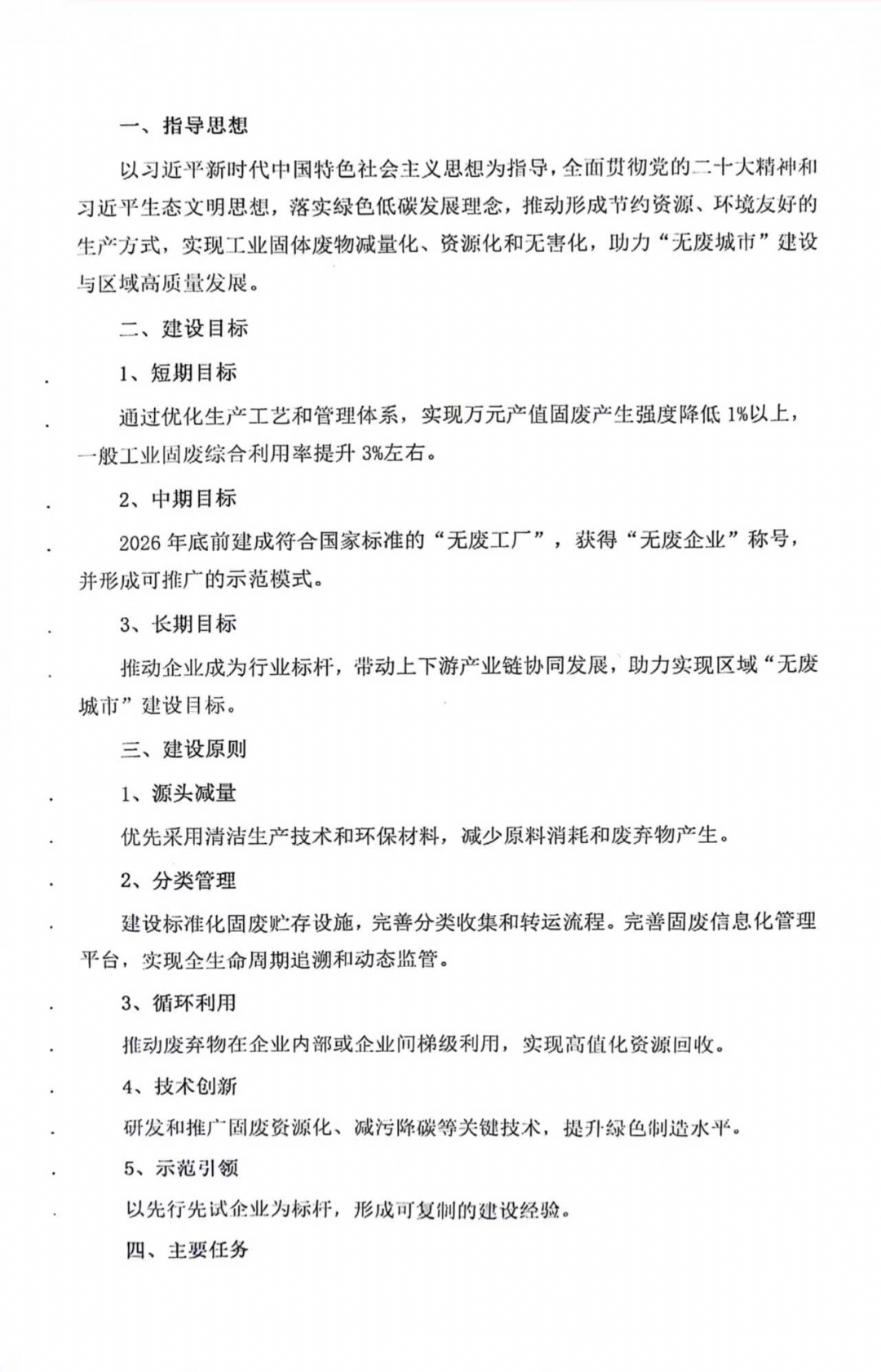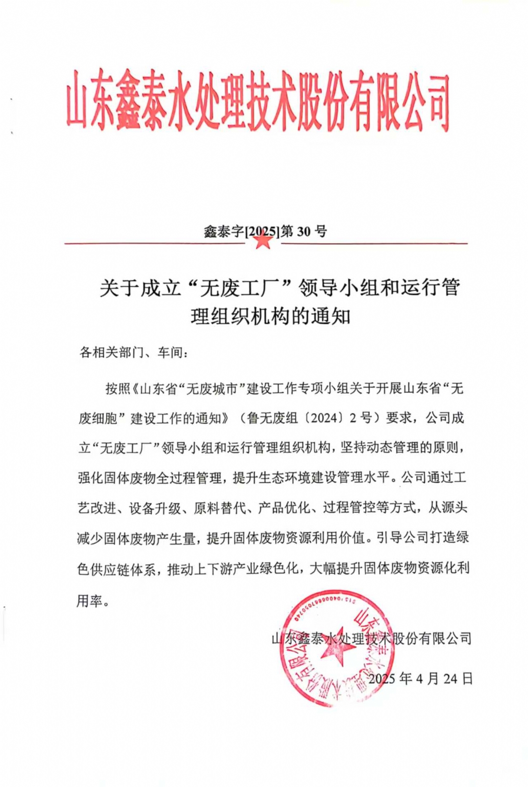 山東鑫泰水處理技術(shù)股份有限公司“無廢工廠”建設(shè)工作實(shí)施方案
